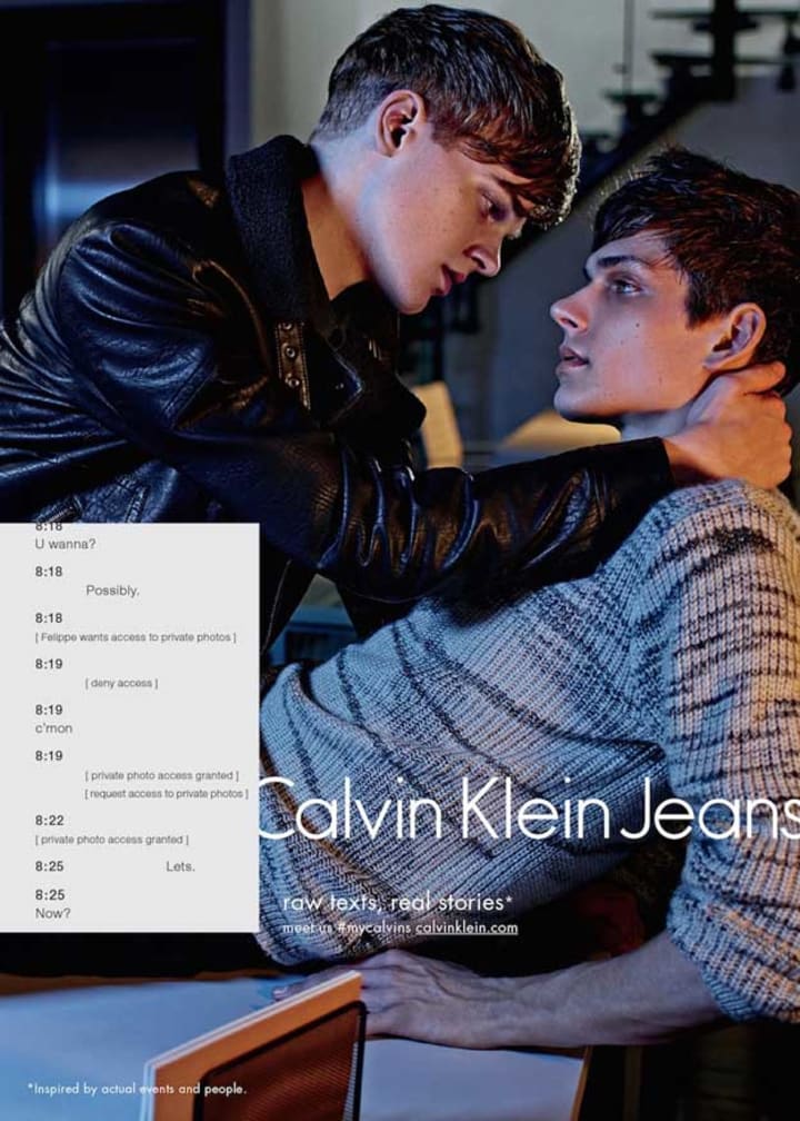 Longtime fashion retailer Calvin Klein is no stranger to ruffling feathers with their advertising, and their #MyCalvins campaign was no different. Their tagline "raw texts, real stories" was noted to be "inspired by actual events and people," presenting stories of lust and yearning through a young, wild, and free viewpoint that parallels today's culture of hook-ups. These unspoken strangers' exchange of nudes before meeting up demonstrates that the gay community mimics behaviors of their counterpart's, and flirtation and desire is universal.