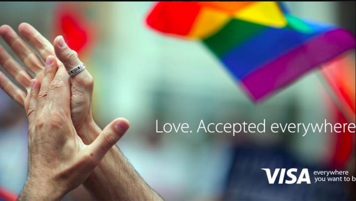Though the creditors ad was created in spirit of Lesbian, Gay, Bisexual, and Transgender Pride Month, it does not take away from its significance. Such a short, yet impactful statement, Visa's "Love. Accepted everywhere" became a spinoff for their slogan "Visa. Accepted everywhere." The simplicity of the image, coupled with the brilliance of the pride colors flushed in the background, gives consumers a feeling of comfort, much like when using their services. Pride month is a great opportunity for couples to celebrate new marriage laws, but also for brands to distinguish themselves.