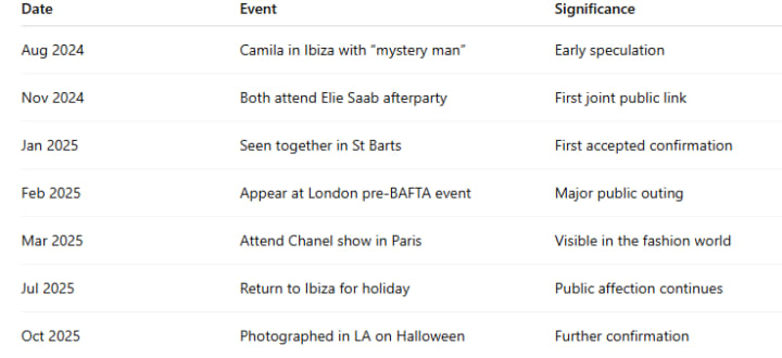 Several appearances throughout 2025 have added credibility to reports that Henry and Camila are in a relationship. The timeline below summarises the key moments: