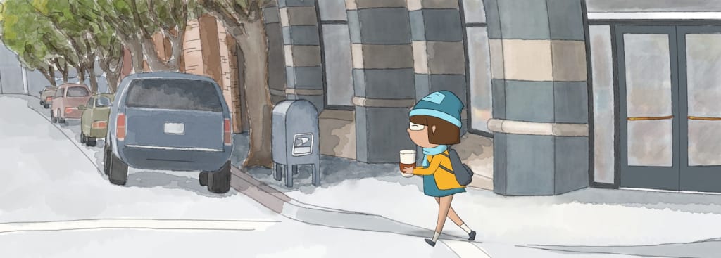 Kim’s own project titled Hot Chocolate tells the story of a girl who had to adjust to her new environment after recently moving away from home. The one thing that gives her comfort is hot chocolate. On an excursion in her new city to get more, she has an encounter with one of her unhoused neighbors and it changes her perspective. Take a look at this award winning adorable piece of art at Hot Chocolate