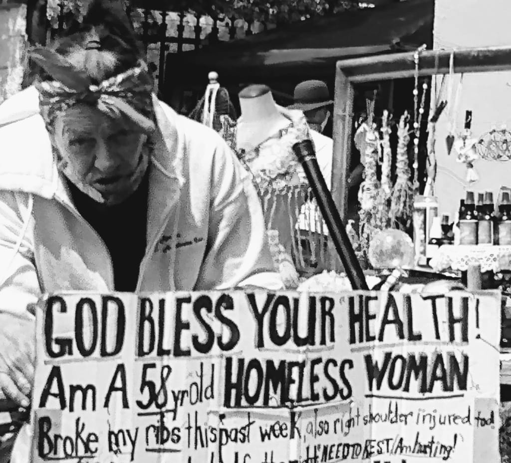 Jenny fights her disability and her pain with heroin, partially due to the lack of access to medical care. She is more functioning than people I have met who take prescription pain medications. She is witty, kind, and has more gumption in her pinky finger than 80% of the population. She is a permanent 7 - as in that is how she stands. Her back, so broken and disfigured, she can no longer stand upright. She is homeless and she is one of the most generous individuals I have met. She gives of her time, her energy, and whatever she brings in flying a sign with those around her. If there is anything I've learned from working with unhoused individuals - respect, built trust, and the community they have built is more precious than our societal structure acknowledges. They are human - each and every one of them, but as "the haves" of our population make decisions, they are not even given a seat at the table.