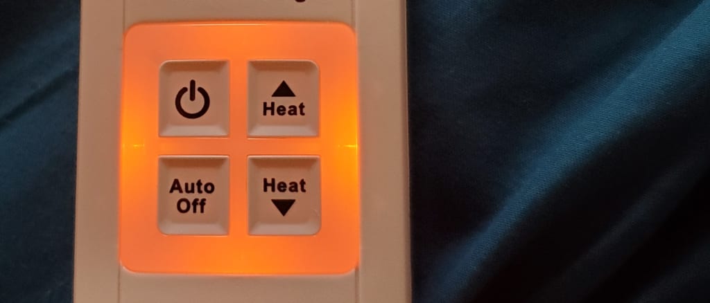 The middle section contained four buttons that floated on a translucent, back-lit bit of plastic. The power button was in the upper-left corner. The auto-off override control sat in the lower-left corner. The two buttons on the right were the temperature select buttons, up & down. It was this middle section that inspired so many of my nightmares while I was bedridden.