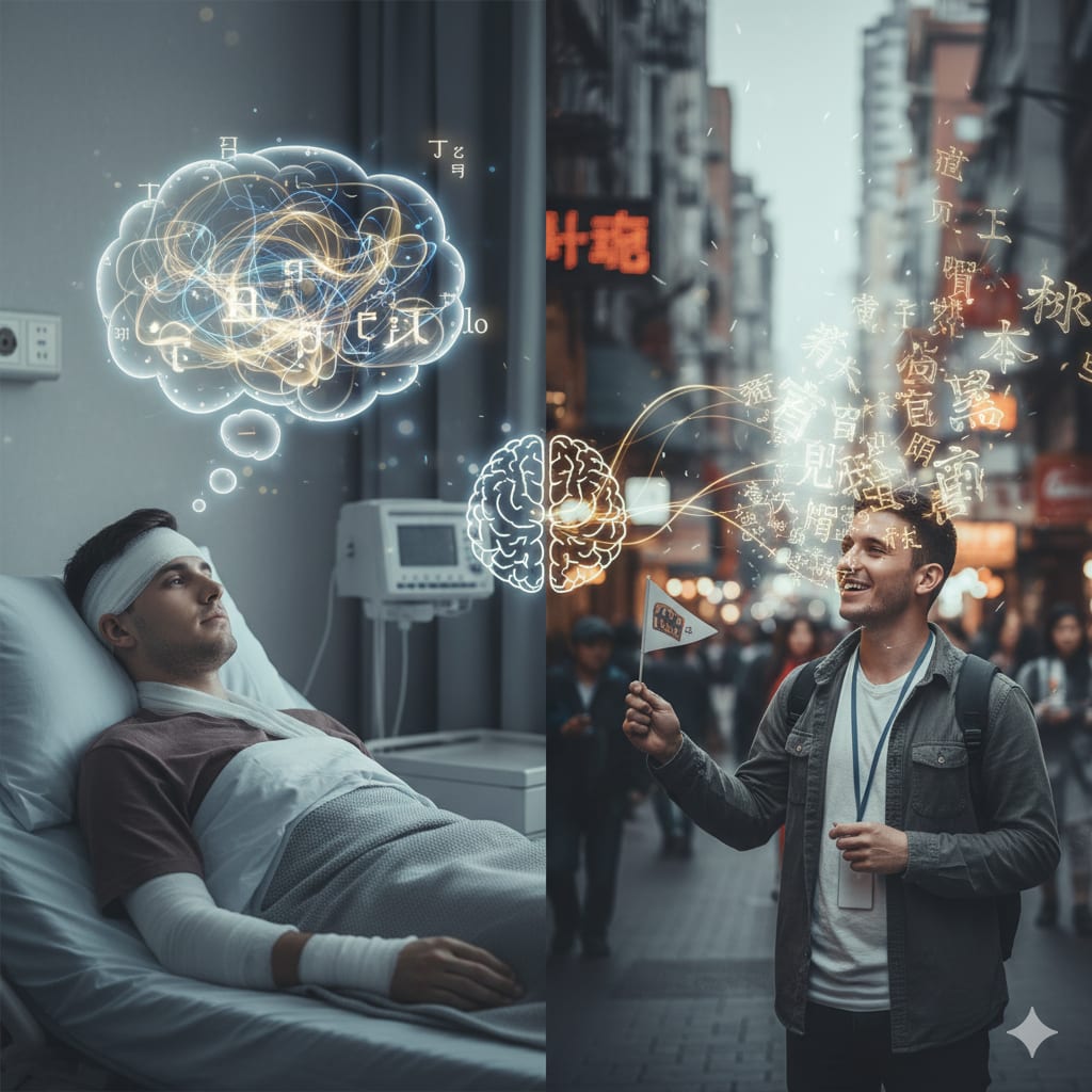 2- Subconscious Unlocking: My other theory is that our minds are so incredibly powerful that they actually record everything we see and hear. Think about all the foreign language movies, shows, and conversations you’ve been around over your lifetime. Maybe your mind processed and retained that information subconsciously, and the trauma of the accident somehow unlocked that part of your brain, giving you full access to a new skill set.