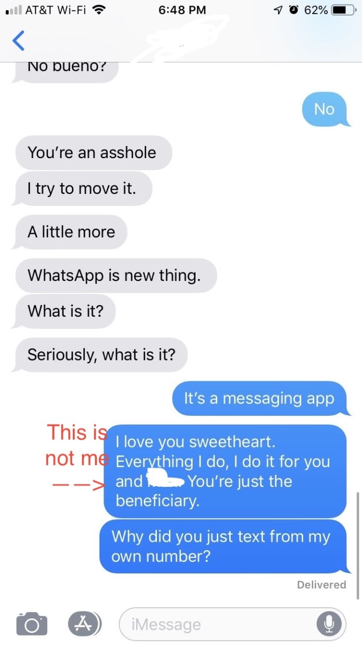 So, if you go to your Apple ID options, if it's attached to multiple phone numbers or emails, you can turn on and off the ability to text from different numbers. So, my ex needed to share his feelings with me, and while he claims he didn't knowingly change any settings, he started texting from my phone number. Because we shared an Apple ID, we had access to each others' contacts. So, he started texting our and my friends from what appeared to be my phone. This lead to a massive amount of confusion and resulted in me having to change the password to my Apple ID because this was not only confusing for our friends, but potentially damaging to my career as I have professional contacts too. (Note: This is probably not new information for many people, but the paranoia it causes when people start reaching out because "your" texts don't make sense and are coming at all hours of the day and night is stressful.)