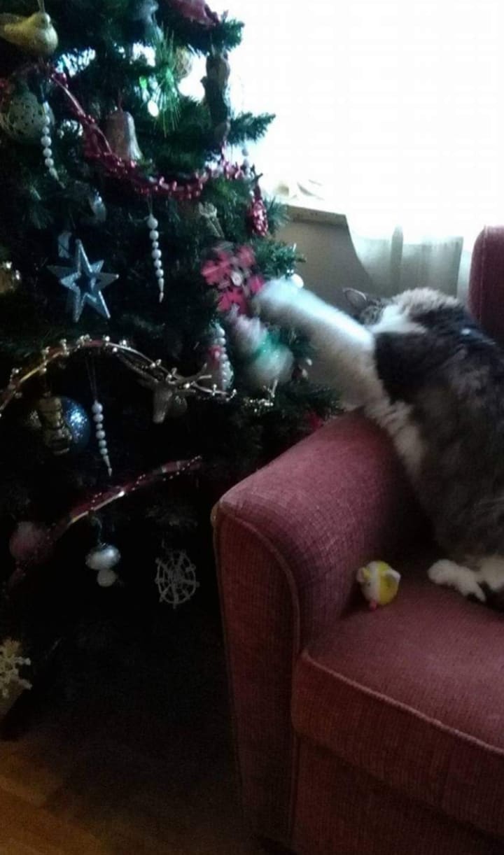 Then just as I relax and become transfixed by the glow of the twinkling lights, the furry-assed grey and white hellion awakes from her catnap. As quickly as the tree is decorated, it is undecorated. Balls, beads, and bows come crashing down, and the game begins.