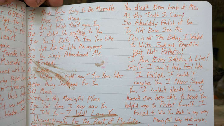 She was hurt, I know She was. She was hurting Herself, and All My Love for Her, Everything of Me that I thought could Heal Her, did not. Defeated and replaced by chemicals that take over Your Mind, Numb Your Heart, and Destroy Your body. If I could Help Her, then I would. But I can't if She won't let Me. Just like My Father, She chose the drugs over Me.