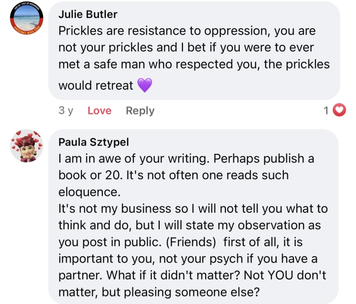 Yesterday my psychiatrist worried that I may never find or accept a partner. That even if I met a “good man” that I would be so prickly and self-protective that I would repel him.