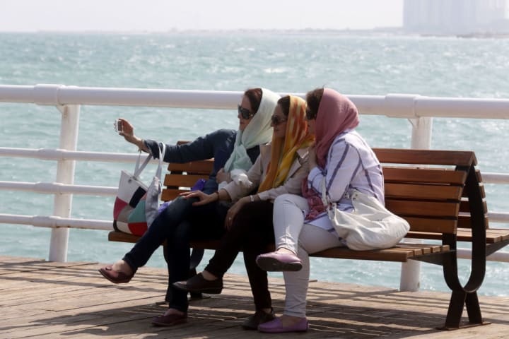 Two best friends, young Iranian women walking along the ocean on the hot sands of Kish (an island in Iran) with their hijab.