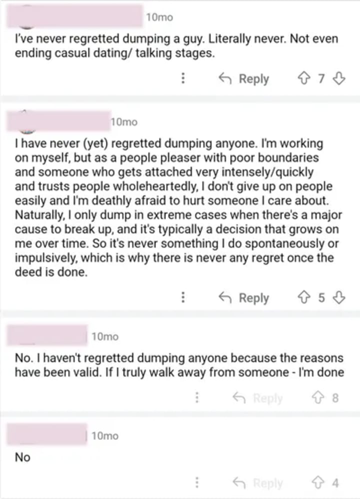 I can’t speak for my guy friends (most of them don’t open up much), but as for me and my girlfriends, the trend checks out. While we may feel empathy or remorse for hurting someone, none of us regret ending the relationships that no longer suited us.