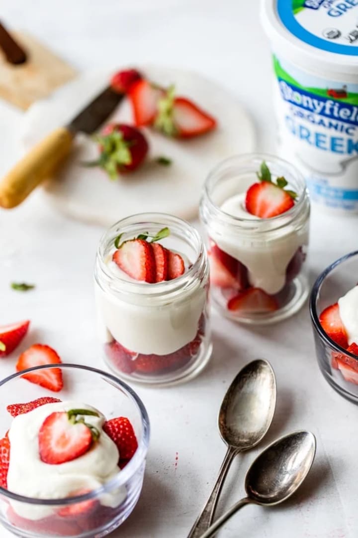 This yogurt whipped cream is so good with strawberries, but if they’re not in season, serve it over another fruit like bananas, raspberries, or peaches.
