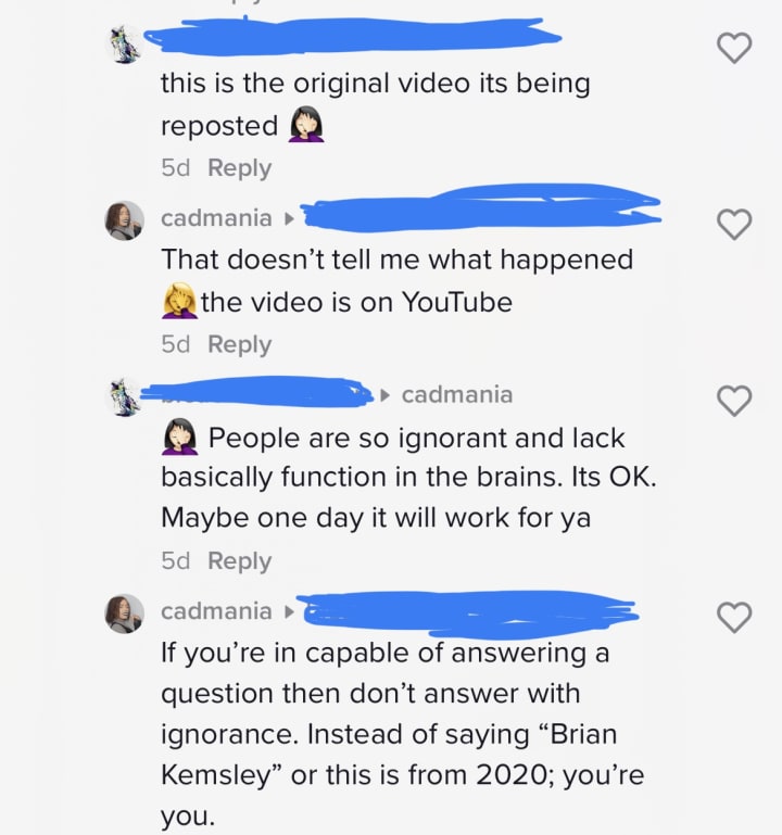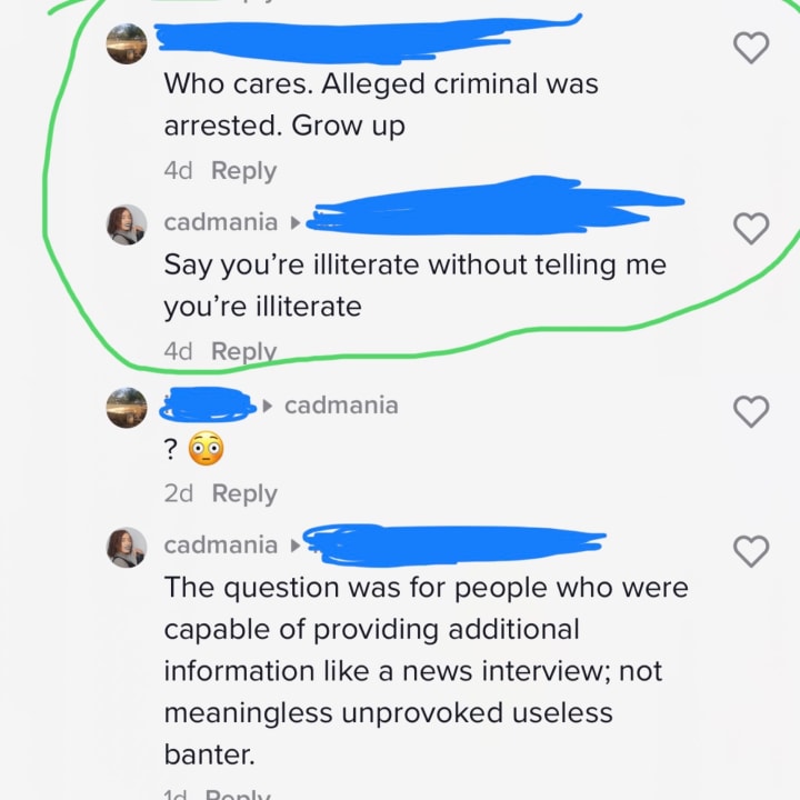 The opening statement is “Who cares. Alleged criminal was arrested. Grow up.” Their disposition disregards the judicial system of the prosecutor and defense attorney; and rather thrives on a concept highlighted in Arthur Miller’s ”The Crucible” where accusations are all that matter based on societal rankism. “There is prodigious fear in seeking loose spirits” (Miller, The Crucible. 1952), this is the only concept that would attempt to explain how irked they are that I asked a question. I admit I responsed with a snarky comment to match their emotional intelligence to communicate of “tell me your illiterate without telling me you’re illiterate”, the indicator that they did not properly read my question of “Where’s the original video? What happened?”; which seemed to have confused them. Perhaps my response startled them that someone would dare be rude back but I digress. I further explain “The question was for people who were capable of providing additional information like a news interview; not meaningless unprovoked useless banter.” Their response is meaningless because of how irrelevant we are to each other. They are nothing to me and I am nothing to them. Their obnoxious response of blind insinuations of “grow up” indicates their assumption of my emotional intelligence; I presume it stems from how they perceive my age based on my looks. Most importantly, their boorish response are completely unprovoked. There are no offenses taken. There are no barbaric comments. I am not fighting with anyone. I am asking for additional information on what is happening. This is a conscious choice to respond with rankism.
