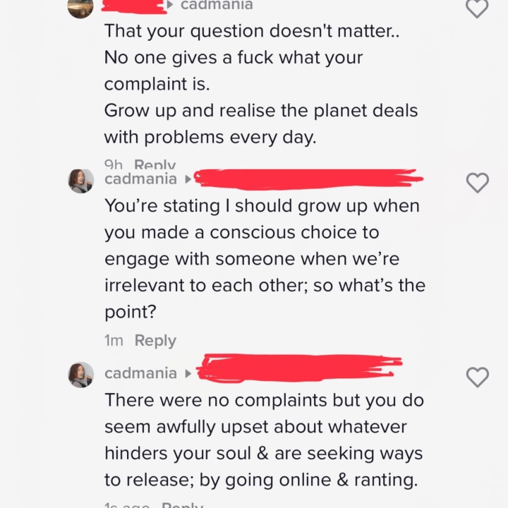 Their expected response follows as “That your question doesn’t matter..No one gives a *&/* what your complaint is. Grow up and realise the planet deals with problems every day”. Perfect demonstration of rankism, they have decided my inquisitive question does not matter and does not deserve answer but only their obnoxious respons; it is failed rankism. I admit I did peak at their account since it was public like mine because I wanted to see what made them feel so “above me”; and I could not find anything. Let’s continue with their response “No one gives a *&/* what your complaint is”, they are attempting to validate their behavior to continue their behavior and I presume I am supposed to accept that this (I presume based on their videos on TikTok) male has told me no one, including the over 8,000 people who appreciated me asking my question to gain deeper insight; and attempting to twist my words narcissistically by claiming I made a complaint. There are no complaints, the dictionary will tell anyone that a complaint is an expression of discontent, regret, pain, censure, resentment, or grief; lament; faultfinding and based on the dictionary’s definition I am not the one complaining but rather they are. They finish their lament with “Grow up and realise (If you’re attempting to correct their grammar I can assure you that ‘Realise’ and “Realize” are the same word but realize with a ’z’ is mostly found in America and Canada and realise with an ‘s’ are found in UK, Australia, or New Zealand) the planet deals with problems every day.” Again there seems to be an assumption of my age and who I am; based on my comments it seemed evident I read a lot not my emotional intelligence or intelligence.