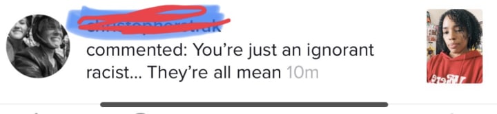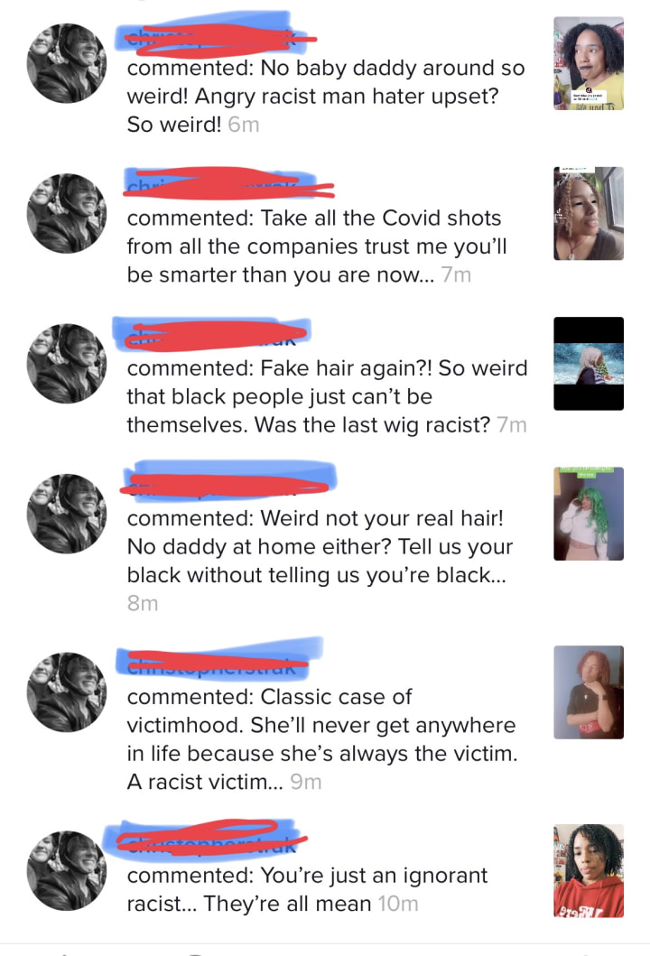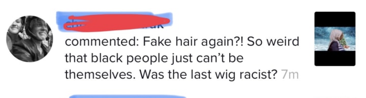 “Fake hair again?! So weird that black people just can’t be themselves. Was the last wig racist?” This is a very interesting comment because they have referred to myself as racist…to the dictionary “Racist (noun) : a person who believes in racism, the doctrine that one's own racial group is superior or that a particular racial group is inferior to the others.” (Dictionary.com) and “Racism (noun): 1) a belief or doctrine that inherent differences among the various human racial groups determine cultural or individual achievement, usually involving the idea that one's own race is superior and has the right to dominate others or that a particular racial group is inferior to the others. 2) Also called institutional racism, system racism: a policy, system of government, etc., that is associated with or originated in such a doctrine, and that favors members of the dominant racial or ethnic group, or has a neutral effect on their life experiences, while discriminating against or harming members of other groups, ultimately serving to preserve the social status, economic advantage, or political power of the dominant group. 3) an individual action or behavior based upon or fostering such a doctrine; racial discrimination. 4) racial or ethnic prejudice or intolerance.“ (dictionary.com) this is where we can see rankism rearing it’s head around. The color of my skin indicates being myself are limited to their definitions; again based on assumptions, sterotypes or prejudice concepts. The “last wig racist”, is my hair when the color is lifted, not dyed but again there are no demonstrations they have full comprehension of the video, disregarding the video as well as making a conscious choice to “attack” a complete stranger.