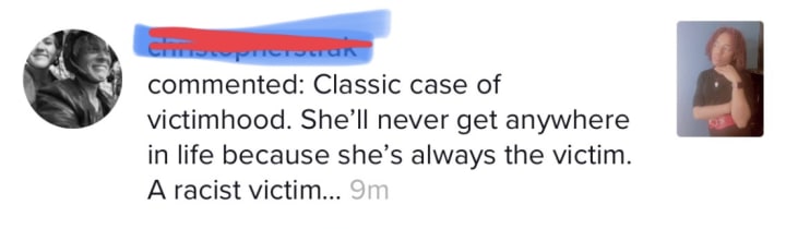 By this comment, I won’t lie I did feel really special and pretty; it takes time and focus to sift through my videos and comment and then delete after posting. Time is something one can never have back. “Classic case of victimhood. She’ll never get anywhere in life because she’s always the victim. A racist victim…” Now they begin with “classic case of victimhood”, victim is a person who suffers from a destructive or injurious action or agency, or a person who is deceived or cheated, as by his or her own emotions or ignorance, by the dishonesty of others, or by some impersonal agency, a victim of misplaced confidence; the victim of a swindler; a victim of an optical illusion; a person or animal sacrificed or regarded as sacrificed. (The Dictionary) between victim and the added suffix “hood” to indicate state or character; a fun audio is met with a blind response. Their response is actually the reason why I enjoyed the audio where a side character asks “what’s the first thing you notice when someone approaches you?”; the reply is ”the audacity”.