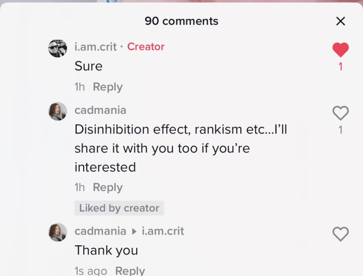 According to the Wired 2013 article quoted above, it seems the Austrailian tiktoker’s confidence thrives in their anonymity but their psychlogical choice of words demonstrates a primitive connection to rankism skill set that are no longer needed. They also quote “Psychologist John Suller wrote a paper on this in 2004, entitled "The Online Disinhibition Effect", where he explored six factors that could combine to change people's behaviour online. These are dissociative anonymity (‘my actions can't be attributed to my person’); invisibility (’nobody can tell what I look like, or judge my tone‘); asynchronicity (’my actions do not occur in real-time‘); solipsistic Introjection (’I can't see these people, I have to guess at who they are and their intent’); dissociative imagination (‘this is not the real world, these are not real people‘); and minimising authority (’there are no authority figures here, I can act freely’). The combination of any number of these leads to people behaving in ways they wouldn't when away from the screen, often positively -- being more open, or honest -- but sometimes negatively, abusing their fellow internet users in ways they wouldn't dream of offline.” (Martin, Online disinhibition and the psychology of trolling 2013). The dissociative anonymity is a strong factor that are commonly seen in the videos posted where people are identifying people who mistreat others. I am older than the internet and watched it’s transition of the slam book where someone probably did not see to the online useless banter they wanted the person to see. They do apply the solipsistic introjection when they continue to presume I should grow up and reacting to a preconceived notion they have created. It is a lonely life for them underneath it all.