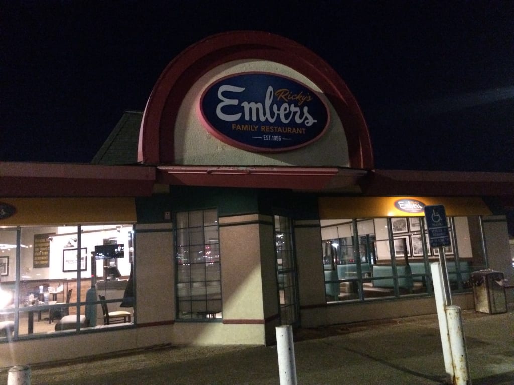 Not much is even open this late or should I say, early in the morning. An agreed upon after work favorite of us both is Embers. We decide to drive a few miles out of the way to avoid bumping into any of our customers. Their great to wait on, but we needed a little distance from the “maddening crowd.”