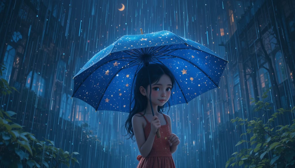It was like no umbrella Maya had ever seen. The fabric was deep blue, like the night sky, and it was covered in glowing stars and moons that sparkled even in the dark. The handle was carved from smooth wood and shaped like a crescent moon.