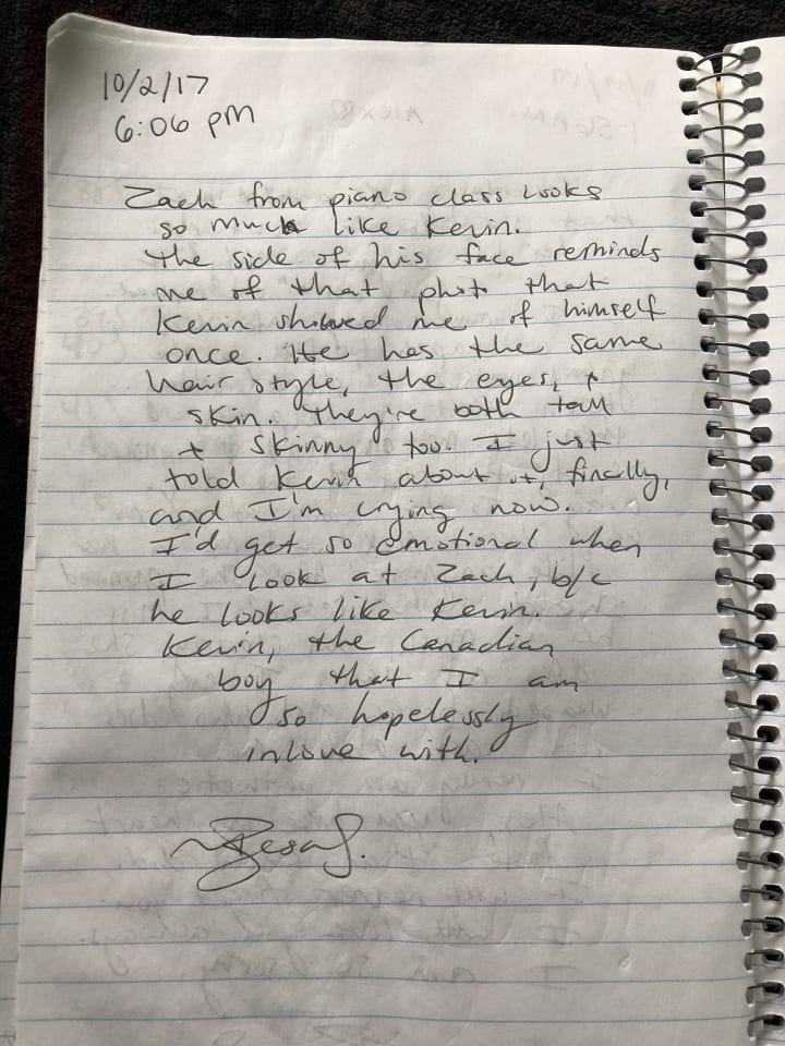 Jumping forward a few months of sadness and sorrow, I am showing you an entry in October when I began my piano class. A boy named Zach reminded me of Kevin. From the same hair cut with black hair, the same light-skinned tone, the same eyes. I remember crying everytime I would look at Zach. Because he reminded me of my love, Kevin. Kevin... the Canadian boy I was so in love with, but could never have as my own.