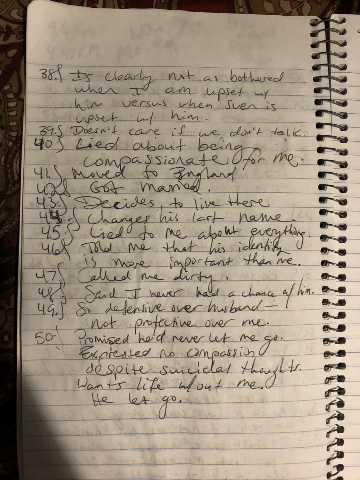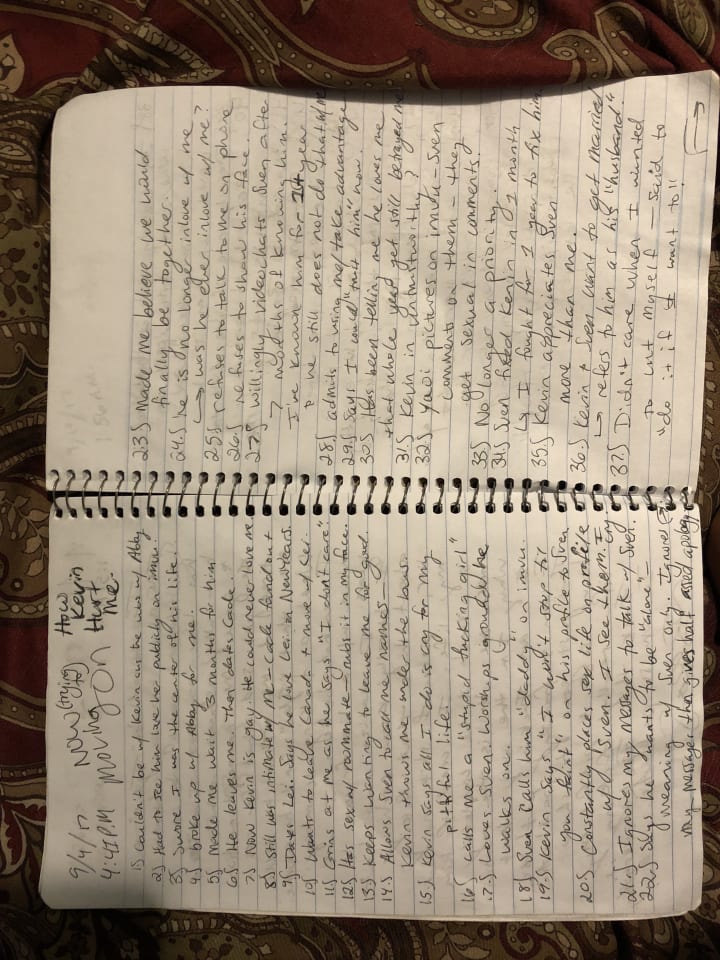 I wrote out a list of all the bad things that Kevin had ever done to me. This was because I was so obsessive on all the good he had done for me, making me fall more and more in love with him. So I wrote out this list so that I could get myself to hate him. Pitiful, isn't it? It didn't work though. In the end... I still loved him.