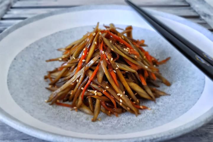 Dishes made from burdock root include : kimbap, stir-fried burdock root, fermented burdock root, fried burdock root,...