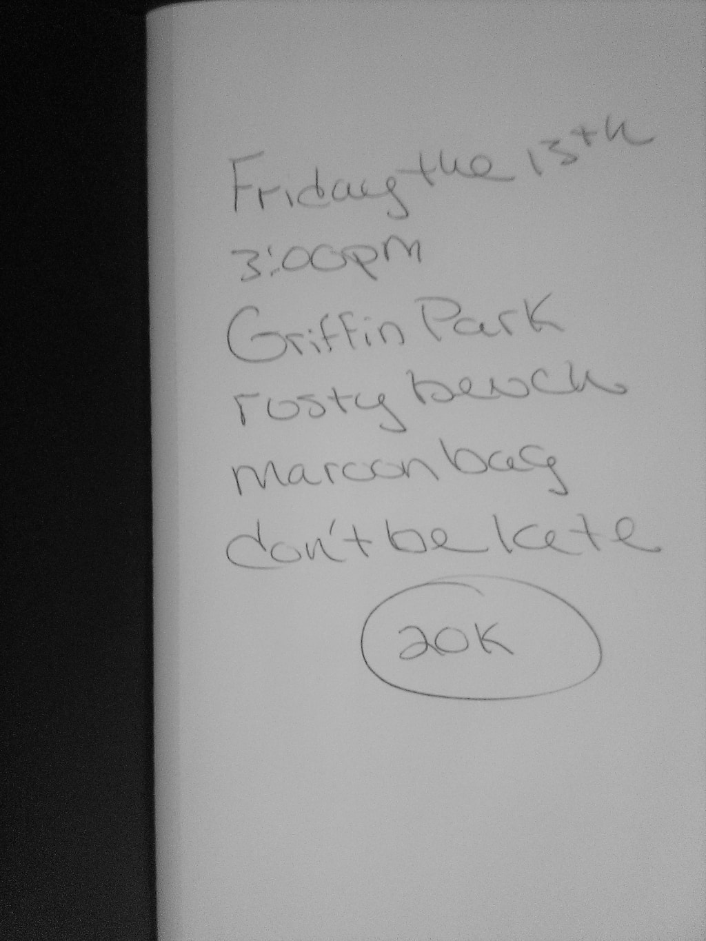 Well now that is especially odd! she pondered, as the first page had today's date. Friday the 13th,3:00 pm., Griffin Park, rusty bench, maroon bag, don't be late, with 20k circled. Quickly rifling through the rest of the pages, none of it made sense.