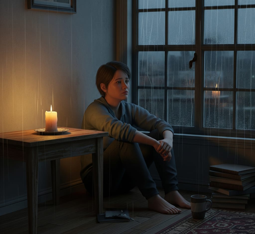 I sat on the floor, hugging my knees, candlelight flickering against the walls, rain pounding like a drumbeat. And strangely, it felt like relief. Like my body had been begging me to let go, and I finally had.