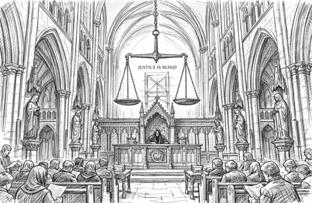 And so the Great Machine grinds on — ancient, hungry, composed — turning human complexity into ash and case numbers. Behind the bench, the seal remains fixed, its promise a cold comfort to those already consumed by the dark.