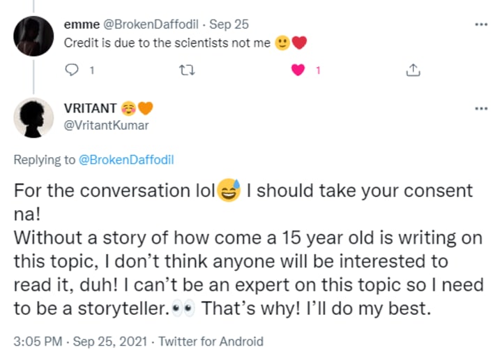 In that excitement, I said that I’d write an article on the same and asked for her permission to use our tweets and replies and then she replied: “Credits is due to the scientists and not me.”