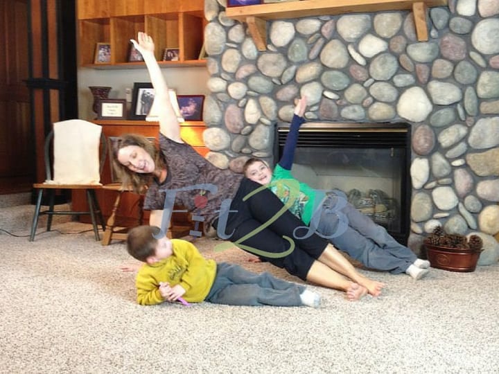 We feature many side bridge (sometimes called the side plank) styles and alternatives in several different Fit2B home exercise videos. The photo above is from one of our kids routines. My favorite cue for this position is “lift your side ribs away from the floor.” My favorite way to progress the side plank is as follows: