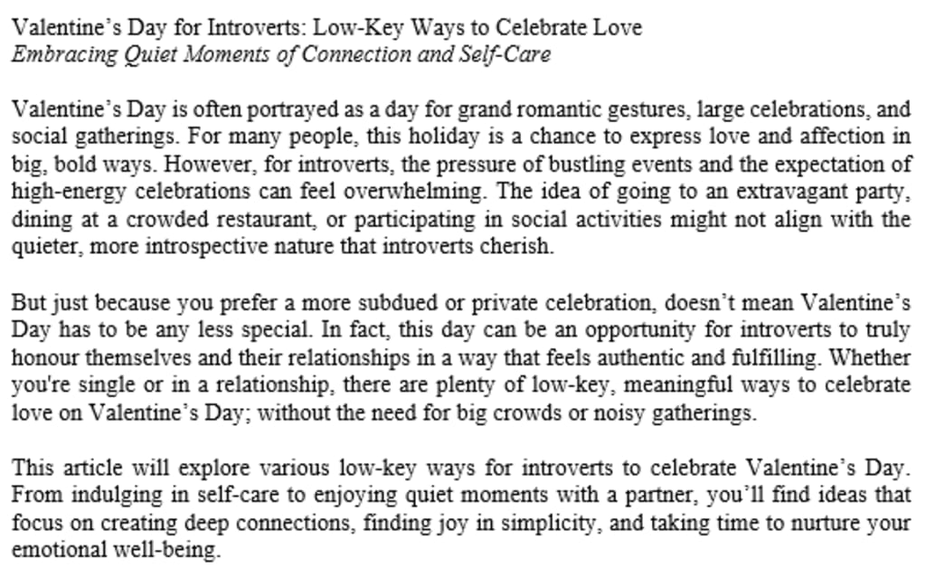 Valentine’s Day is about love, but that love doesn’t have to be expressed in loud, public displays. For introverts, this day is an opportunity to create a celebration that is meaningful, quiet, and deeply personal. Whether you spend the day alone or with loved ones, it’s important to recognise that self-love and connection come in many forms. By focusing on activities that honour your introverted nature; such as self-care, intimate gatherings, and quiet reflection, you can make Valentine’s Day a truly special occasion that resonates with your values and needs.