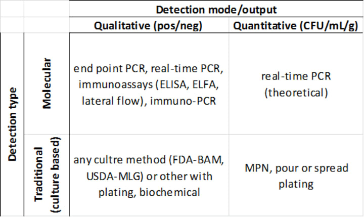 Some examples of qualitative detection methods include end point PCR, real-time PCR, and traditional culture methods for pathogens such as Salmonella, E. coli O157:H7 and other STEC, Listeria monocytogenes, and indicator organisms like Genus Listeria. Examples of quantitative detection methods include petrifilm plating, standard agar plating methods, and most probably number (MPN). Target organism(s) include things like Enterobacteriaceae, generic E. coli, coliforms, Staphylococcus aureus, and many others. All of these methods share a common element which is that the result is expressed as a positive/negative or as a concentration.