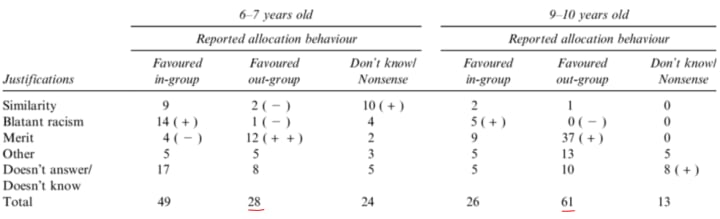 In fact, even amongst the younger group where kids were much less likely to share outwith, a considerable number of them did still show a lack of bias by sharing equally with the other group: