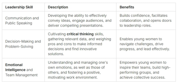 Young women aiming to lead tomorrow need a variety of skills. These include effective communication, critical thinking, and decision-making. They also need problem-solving, emotional intelligence, and team management.