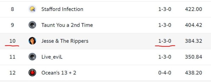 Well, you’ll be happy to know, I’m not in last place, anymore. That penalty by you, from that ill-advised gamble, resulting in that touchdown run by David Montgomery, his THIRD of the game, that gave me so many points in my matchup! It helped me tremendously and I won my first game of the year. Not only that, it helped out my point total. I am no longer 12th in a 12 person league. At 1-3, I am 10th in a 12 person league. It’s a small step but it’s a much needed step. The psychological impact on me has been tremendous.