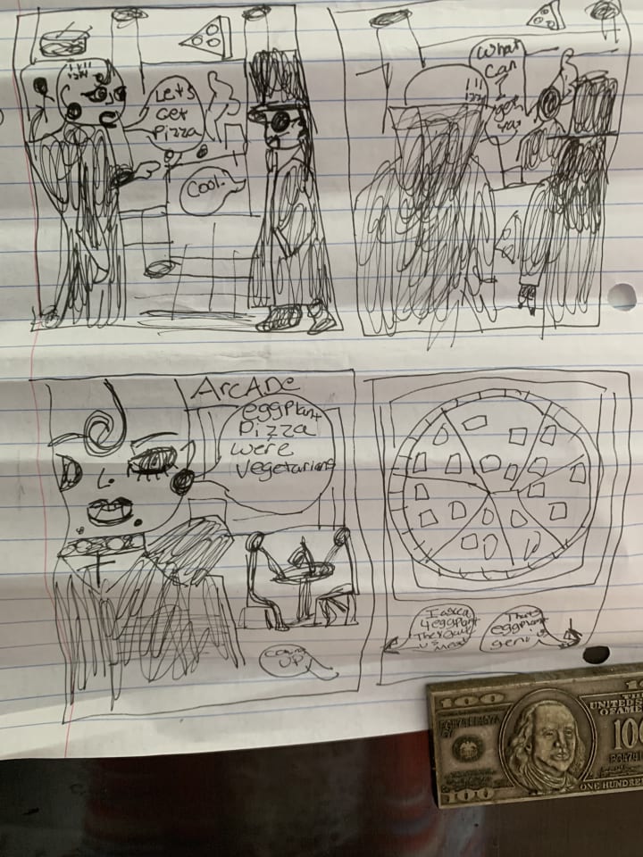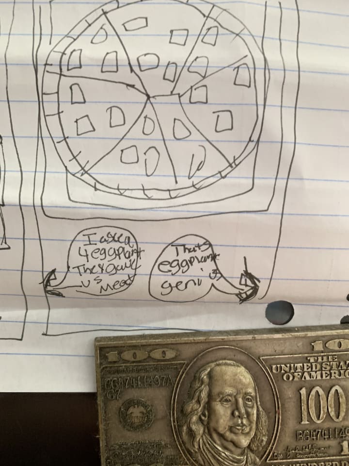 This was inspired by the time when I was a vegetarian my uncle and I ordered a pizza with eggplant and I thought it was meat and began taking off the eggplant and my uncle says that’s not meat