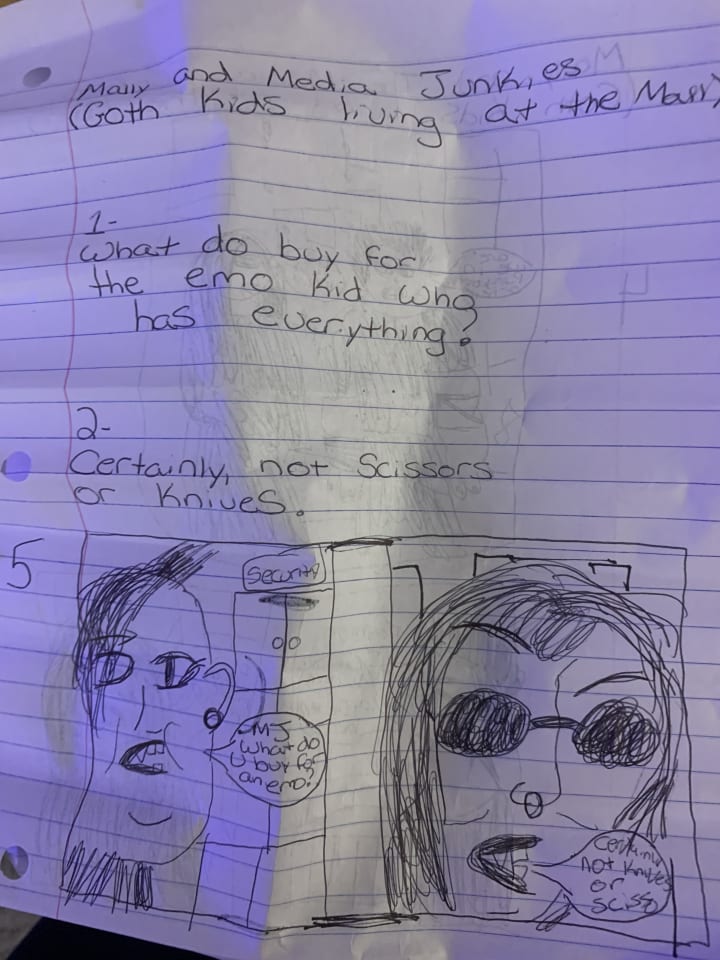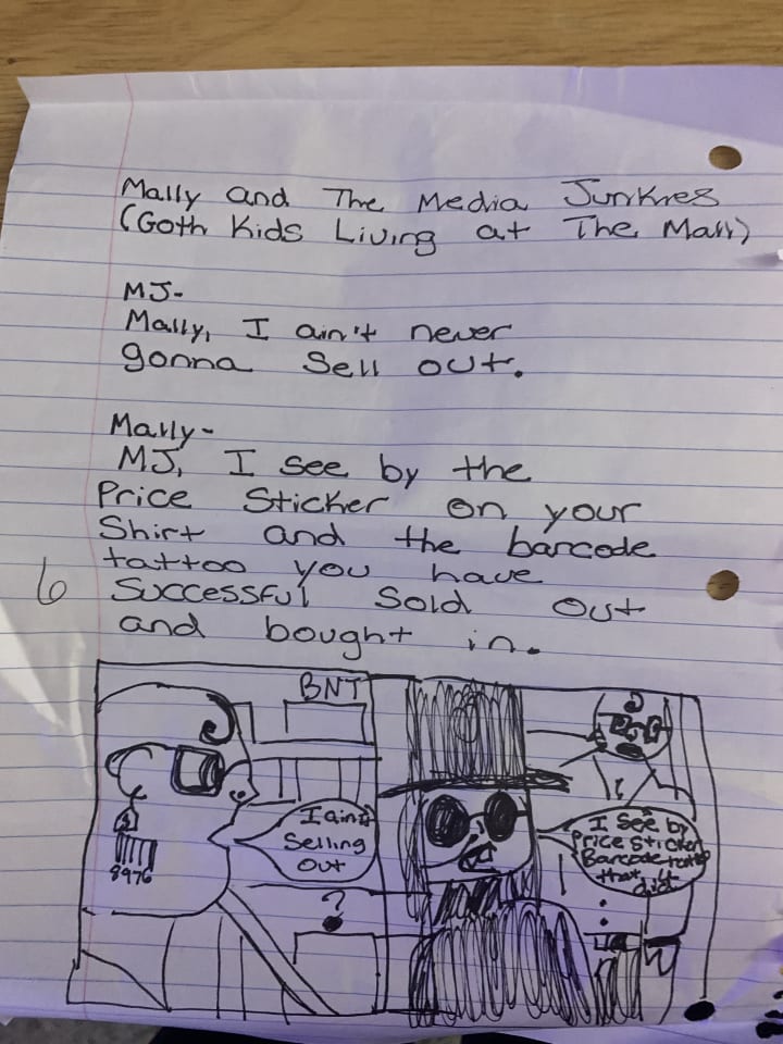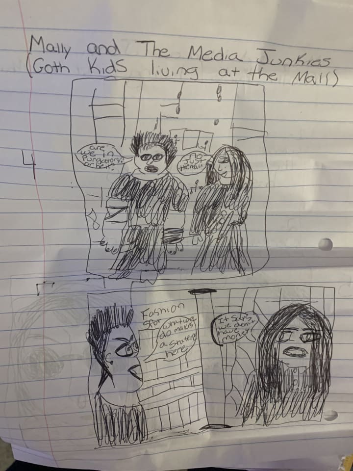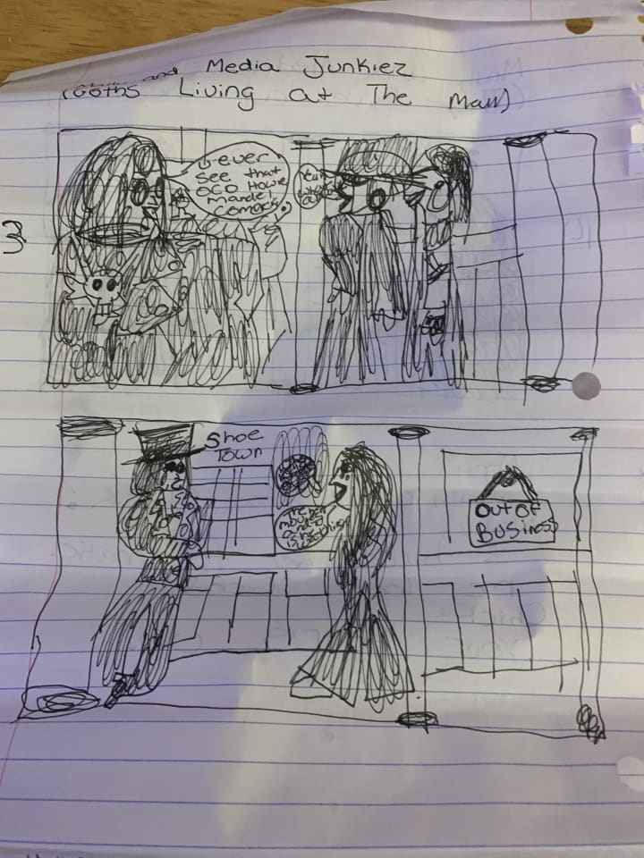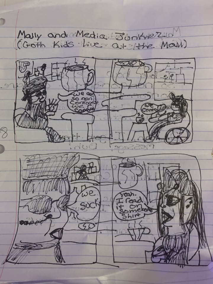 This panel is about two friends who make it through life and it is also a commentary on modern society through the eyes of goth and Metal kids who hang out at the mall.