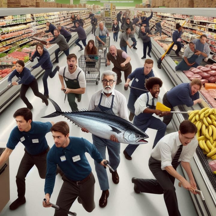 Suddenly, employees from every corner of the store emerged. Cashiers, stockroom clerks, and even an elderly man from the seafood section, wielding a suspiciously large tuna, surrounded the robbers. Everyone was armed with whatever grocery-related weapons they could find. A sudden sense of panic washed over Gerald.