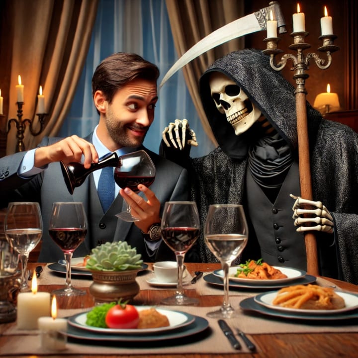 Against his better judgment (or maybe just out of sheer boredom), the Grim Reaper agreed to share a meal. After all, what was the worst that could happen? (Spoiler alert: A LOT. 😂)
