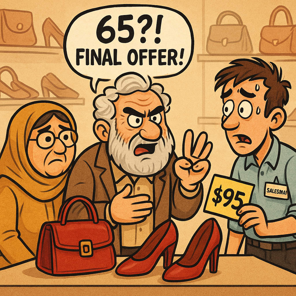 Uncle Hasan shook his head, unimpressed. He turned to Auntie and said, loud enough for the shopkeeper to hear, “See? The one next door was $85 and honestly looked better. I don’t know why we came back here.”