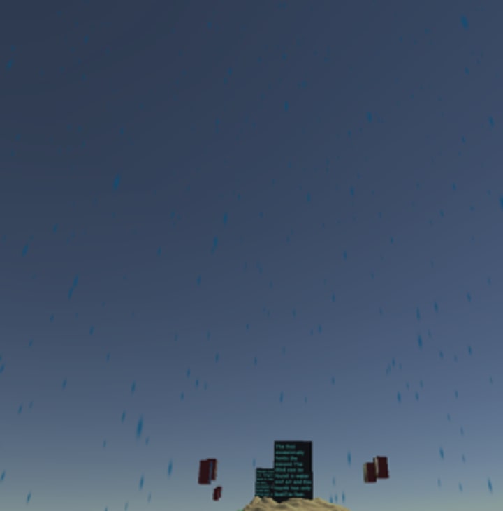 The project began with blender that was used to create the floating islands that became the world and after that it was time for creation of the game's enemies but they ended up being scrapped later down the line. Another thing that had to be scrapped was the player character, these objects were scrapped because they became unnecessary. For you see the project changed direction in the middle from an fps to a game about riddles. That is because it was simple to notice that the script that had been created for the enemy wouldn't work and because it was possible to see right through the enemies. When that was complete the project started to use unity to create scripts. The first script that was created for the project was a movement script because the project needed to have something that could be tested immediately. For the reason that the gamemaster wouldn't lose moral because he couldn't see any meaningful change. When a few scripts were created for the project to continue there had to exist a few riddles so the project stood on hold till suitable riddles appeared. When they did, the project finished up with the scripts.