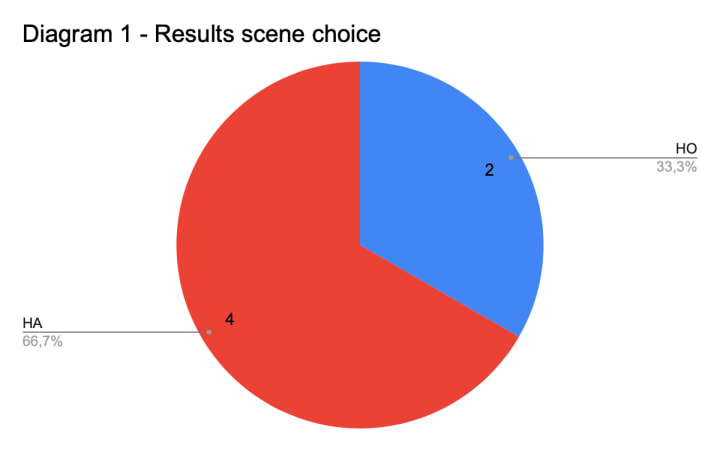 As we can see the respondents of these tests decided to mostly choose one scene. There were four respondents that chose the scene HA and their reasons behind that action was a mix of difficulty, the buttons general location and how the button looked. Furthermore there were two respondents that chose the scene HO and their reasons for that decision was how it looked and its placement on the screen. Lastly there was no one that chose scene SA.