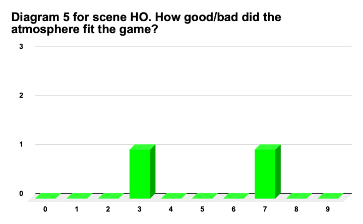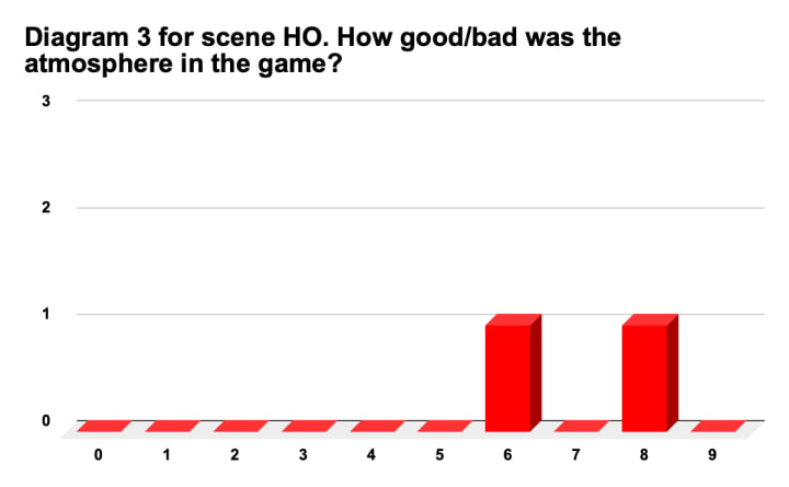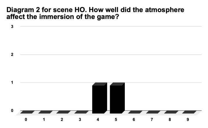 - The player that played the scene HO, their answers were very scattered, one scored it with a three and another with a seven. This could be because it was darker as one of the participants stated and because of the darkness it could have made it so that it was much more difficult to see the text.