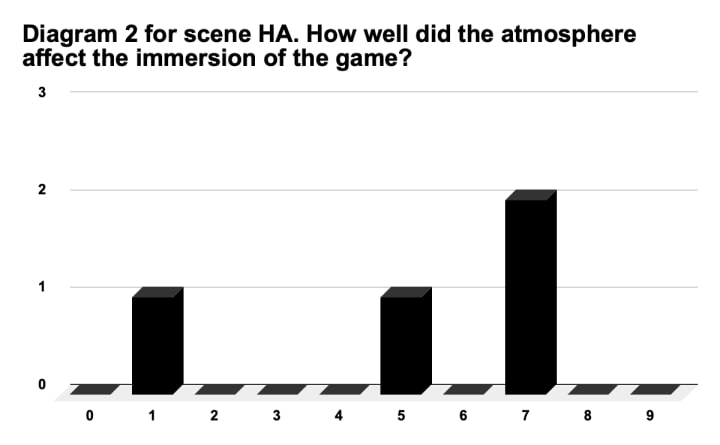 Then the respondents had to rate how the game's atmosphere affected them to get immersed in the game from one to nine. One of the respondents that had previously chosen HO were inclined to pick five and the other respondent chose foure. One of the people that had in previous accounts chosen HA made the decision to choose one while another of the respondents decided to choose five and the last two respondents chose seven.