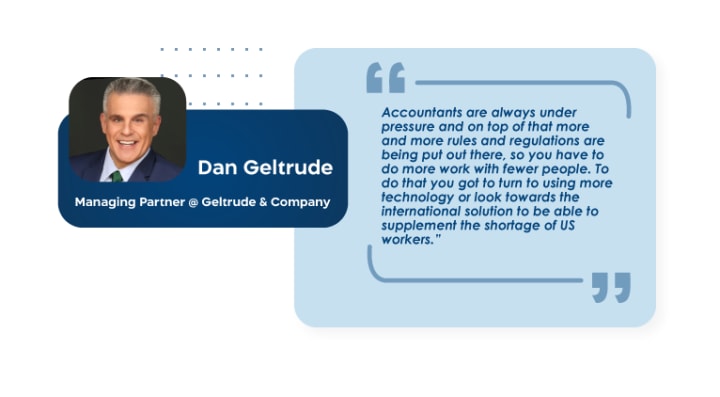 “In the last 2 years, more than 300,000 accountants have left their jobs, and on the other side, they don’t have enough accounting majors. So, this squeeze that the accounting profession is experiencing is serious because you can’t get the work done. Accountants are always under pressure and on top of that more and more rules and regulations are being put out there, so you have to do more work with fewer people. To do that you got to turn to using more technology or look towards the international solution to be able to supplement the shortage of US workers.”
