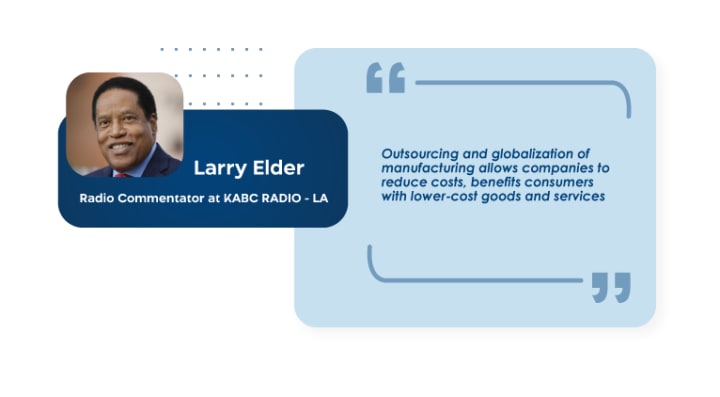 “Outsourcing and globalization of manufacturing allows companies to reduce costs, benefits consumers with lower-cost goods and services, causes economic expansion that reduces unemployment, and increases productivity and job creation.”