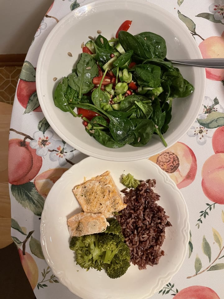 This is what I had for dinner: steamed salmon with brown and dirty rice and broccoli and a fresh salad of spinach, cucumbers and grape tomatoes with roasted sunflower seeds and fresh pomegranate seeds.