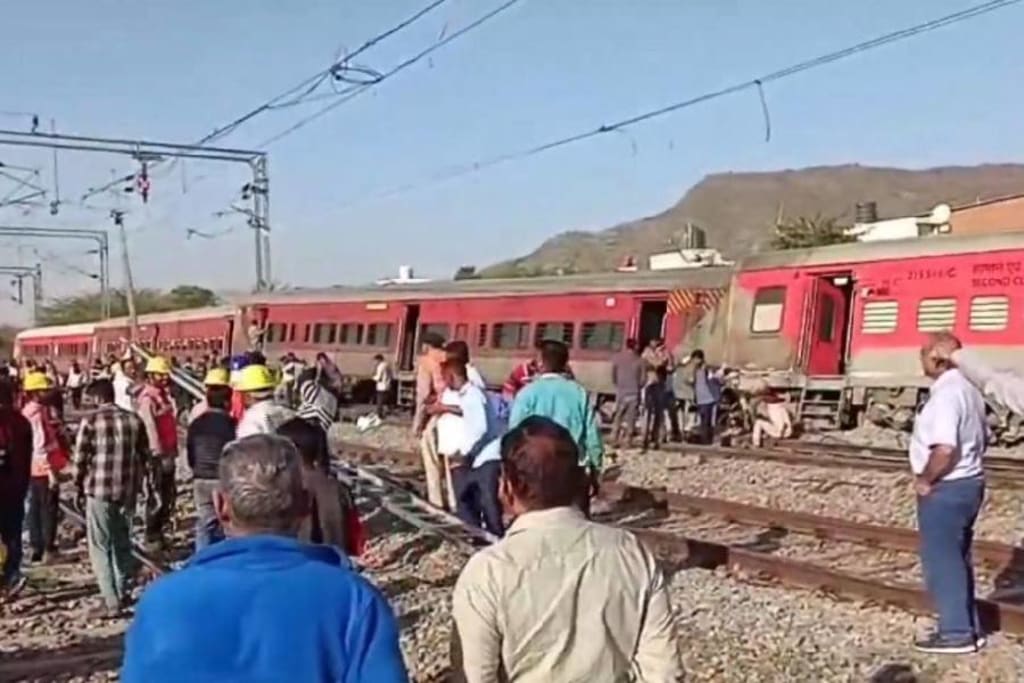 Over the course of the intervening Sunday and Monday, at least four carriages of a superfast train derailed close to the Madar railway station in Ajmer, Rajasthan. In relation to the incident, rescue efforts are in progress. Regarding the event, CPRO Shashi Kiran of North Western Railways stated, "Today, in Ajmer's Madar, a vehicle carrying the number 12548 from Sabarmati to Agra derailed close to the home signal." The train's engine and four ordinary carriages had derailed."