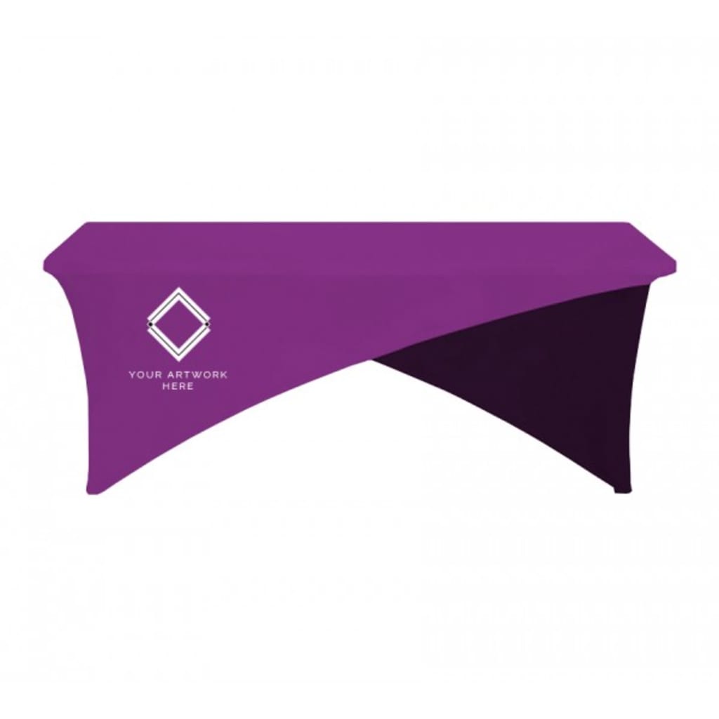 A throw tablecloth is looser and is usually thrown over a table with its folds hanging down. Throws create a richer, fuller appearance. Fitted covers are a blend between throws and stretch. They fit a table’s edges and hang down, maximizing the visible surface area for branding and promotion. A stretch table cover, as the name suggests, stretches over the table and fits snugly down the edges without a loose fold.