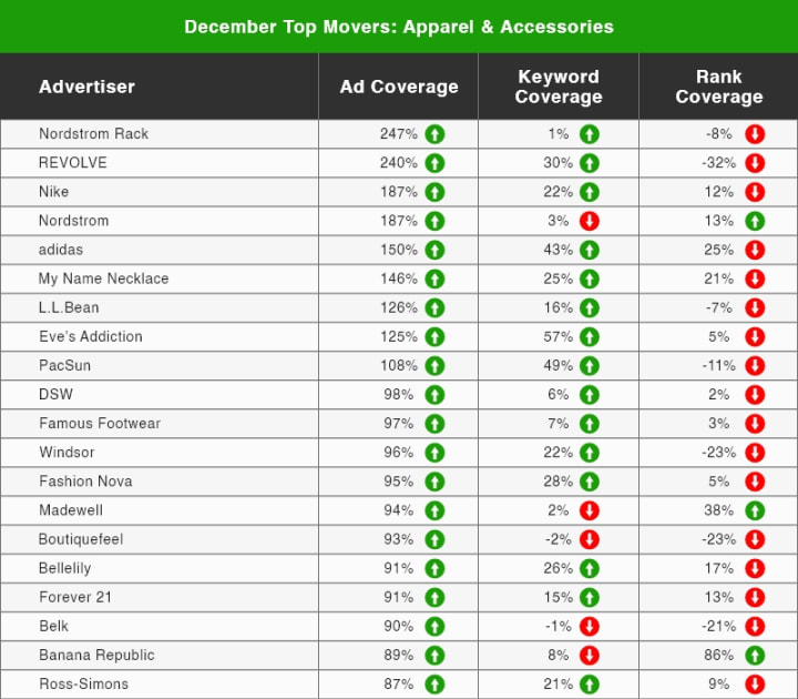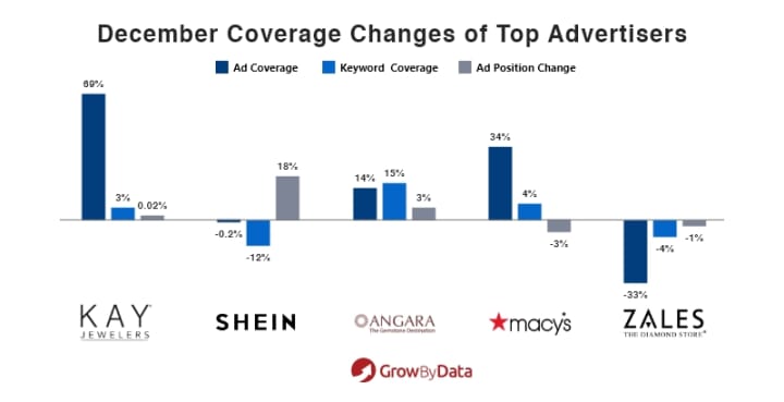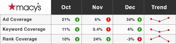 Macy’s ads had seen the second-largest growth in ad coverage behind Kay Jewelers, with a 34% increase in December. Their keyword coverage though had improved by 4% and it had slightly decreased an average ad rank of -3%.