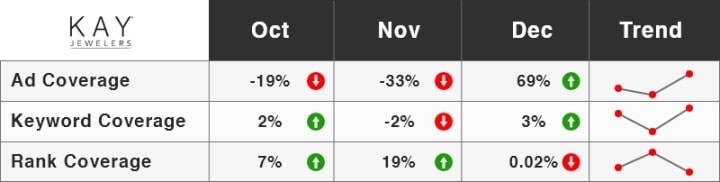 Kay Jewelers saw a 69% increase in their overall ad coverage in December, implying its ad coverage has increased compared to last month. It could also mean that they increased the number of products they were advertising, which can be monitored with the Competitive Marketing Mix Report. They are improving in their keyword coverage as well as a slight uptick in average rank; showing positive performance in this campaign.